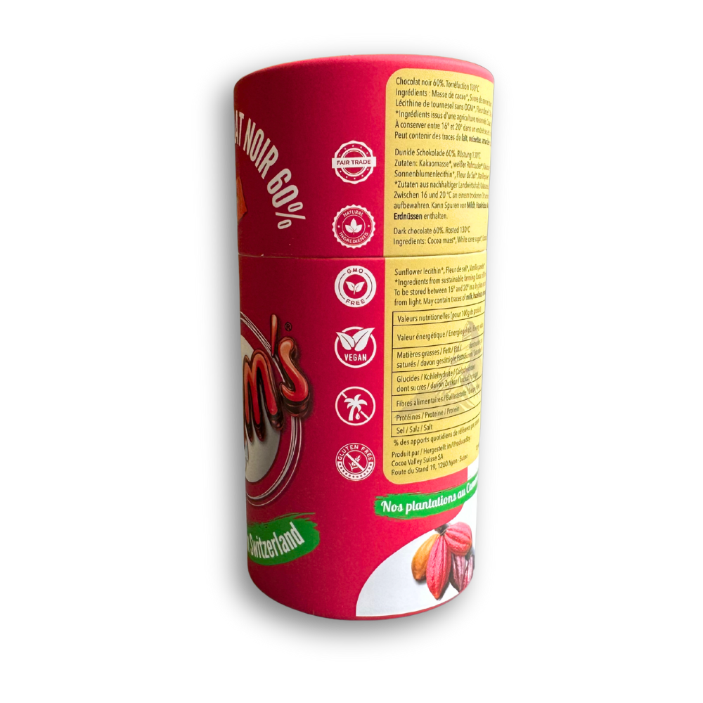 Indulge in our tube of 12 dark 60% chocolates: the perfect balance of aromatic depth and smoothness. Each 20g piece is a promise of pure pleasure, carefully individually wrapped to preserve its freshness and satisfying crunch, while ensuring a perfectly hygienic tasting experience to be freely shared.