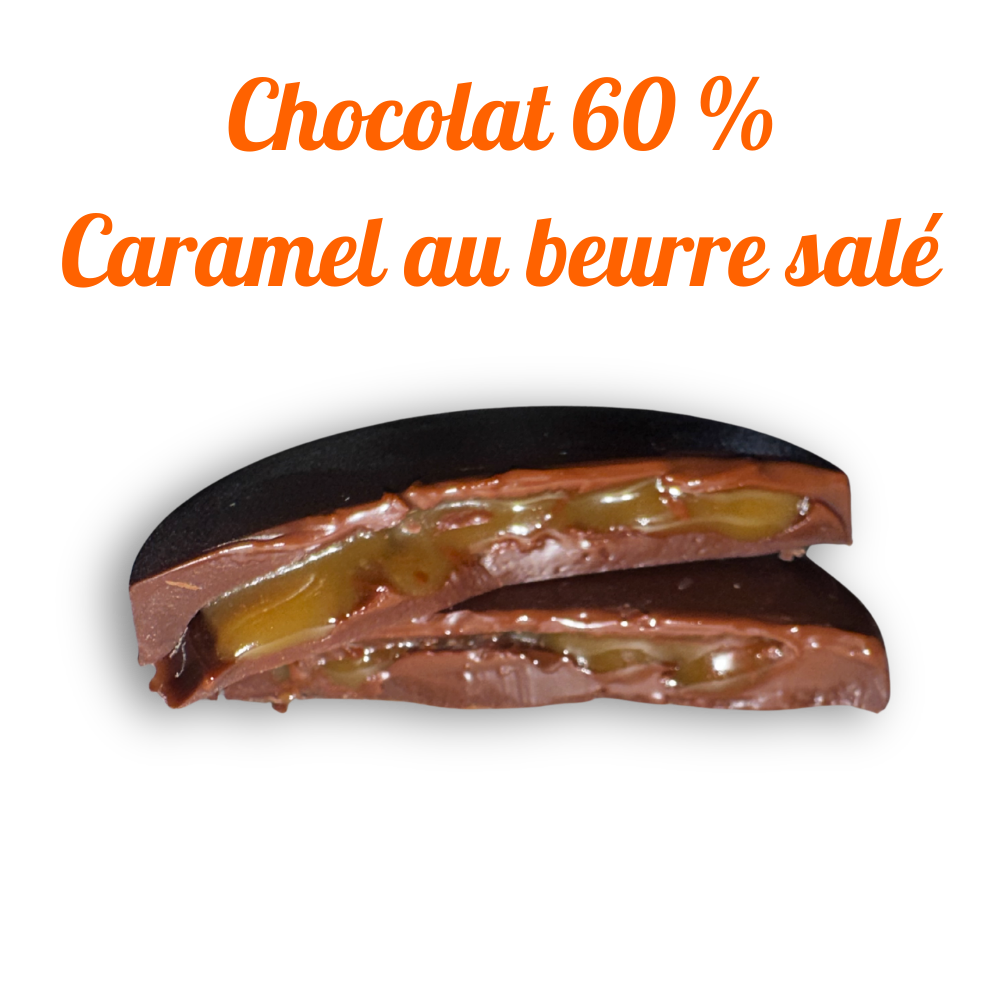 Dark Chocolate 60% – Salted Butter Caramel: Dark chocolate 60% (cocoa mass*, cane sugar*, cocoa butter*, non-GMO sunflower lecithin*, fleur de sel*, vanilla powder*), cream* 35%, sugar*, Swiss semi-salted butter*, fleur de sel*.