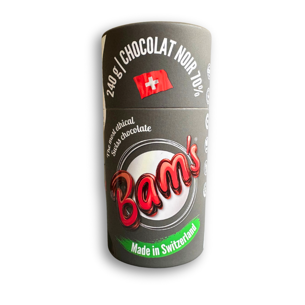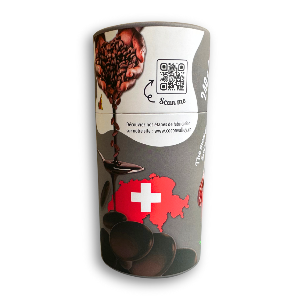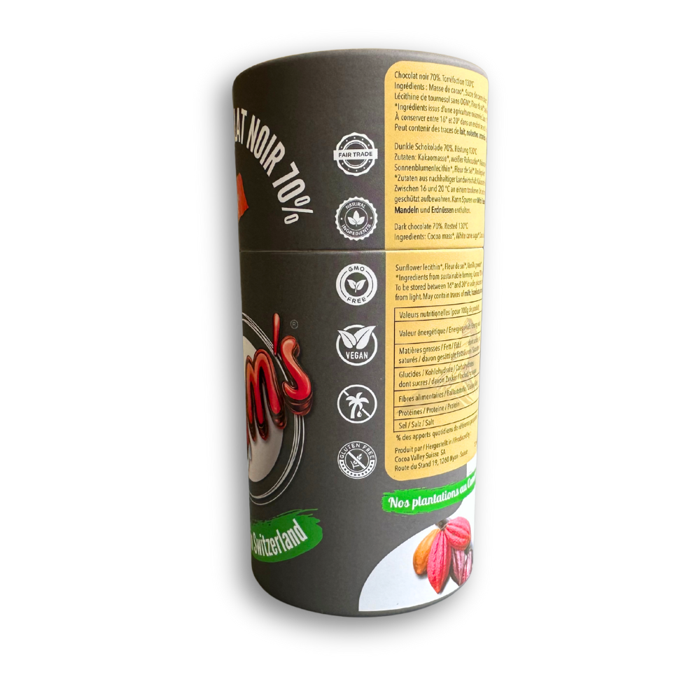 Derrière cette excellence se cachent des origines d’exception : un cacao noble, issu de nos propres plantations au Cameroun, transformé avec l’exigence et le savoir-faire suisse pour une qualité premium unique. Une expérience sensorielle intense, de la fève à votre palais.